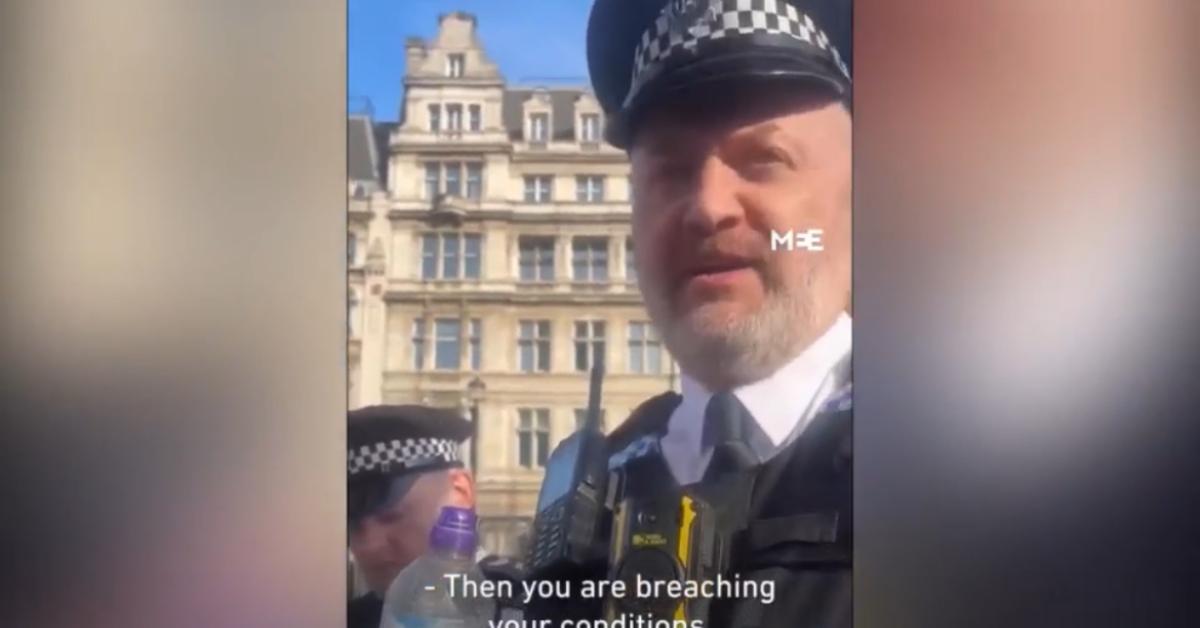 Un agente della polizia metropolitana di Londra è stato filmato mentre diceva ai manifestanti che avrebbero potuto essere arrestati per il sostegno alla Palestina. Cosa che non sarebbe successa se avessero protestato a sostegno di Israele. L'agente ha dichiarato che il mancato rispetto dell'ordine avrebbe costituito una violazione delle condizioni stabilite, che avrebbe potuto comportare l'arresto. Ecco la discussione: