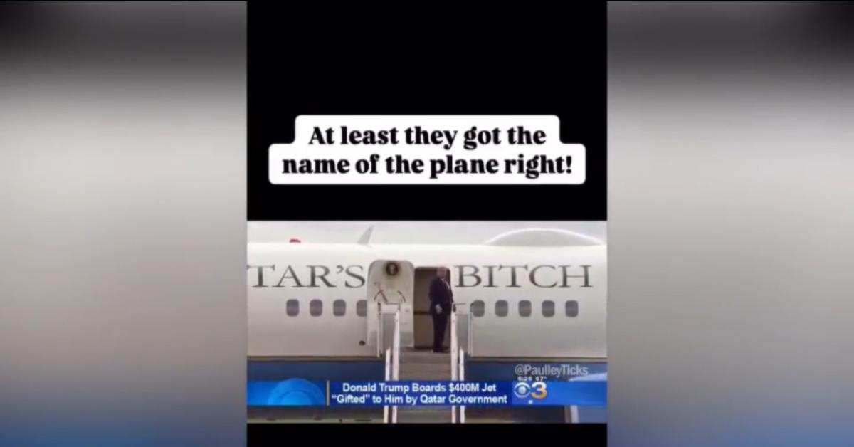 Il presidente americano Donald Trump "sale sul Qatar's bitch, l'aereo da 400 milioni di dollari che gli è stato donato dai reali di Doha". In queste ore sta circolando un filmato che vede il tycoon salire su un aereo, con una scritta sul fianco ben vistosa e che non lascia spazio ad interpretazioni. Non è più un segreto il fatto che il Qatar abbia deciso di regalare un Boeing 747 a Trump. Tuttavia, il video diventato virale in poco tempo è fake. Trump potrebbe esser salito su un aereo con scritto in realtà Qatar's Beotch.