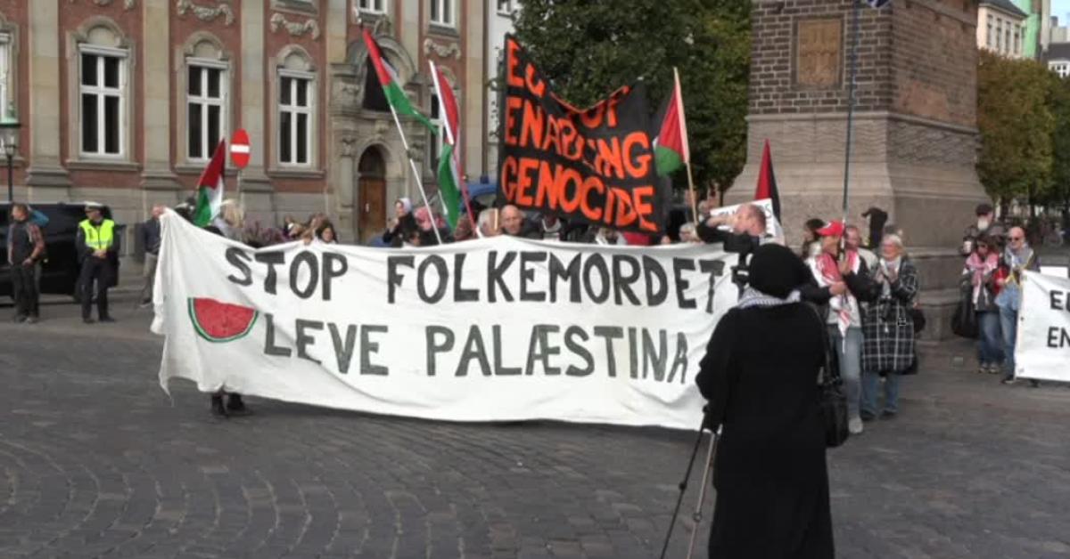 Con bandiere palestinesi e cartelli con scritto "l'Ue finanzia il genocidio", un centinaio di persone sono scese in piazza proprio mentre è in corso il summit Ue nella capitale danese sul rafforzamento del sistema di difesa europeo, in un contesto di crescente minaccia militare da parte della Russia, dopo le ultime incursioni di droni nei cieli di alcuni paesi confinanti con Mosca.
