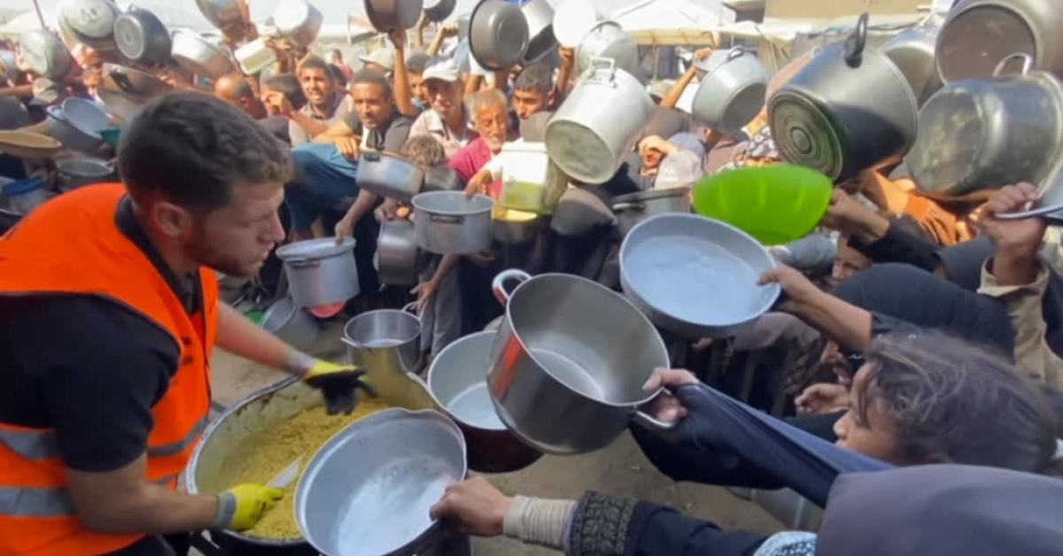 Roma, 3 ott. (askanews) - Gazawi si affollano per ricevere un pasto caldo a un punto di distribuzione a Khan Younis, a Sud della Striscia di Gaza, dove volontari locali, insieme a un'associazione turca, hanno allestito una cucina di beneficenza.