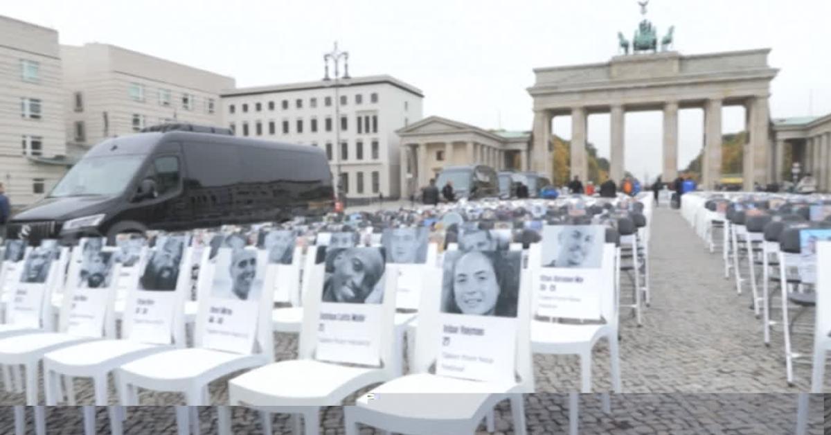Un'iniziativa promossa dall'Unione degli studenti ebrei tedeschi. Sulle sedie le immagini dei rapiti, con il loro nome.
