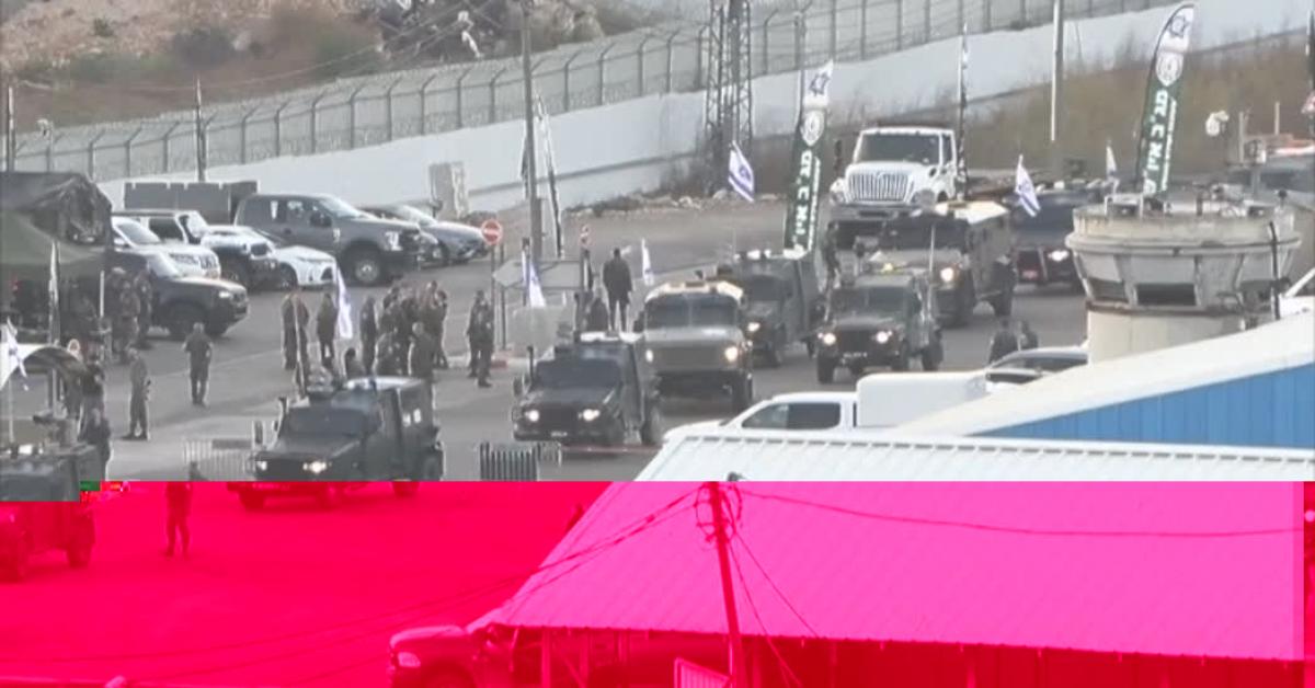 Roma, 13 ott. (askanews) - Nelle immagini, un convoglio di veicoli militari israeliani con bandiere di Israele, arriva alla prigione di Ofer, dove è previsto il rilascio dei prigionieri palestinesi come parte dell'accordo di cessate il fuoco con Hamas.
