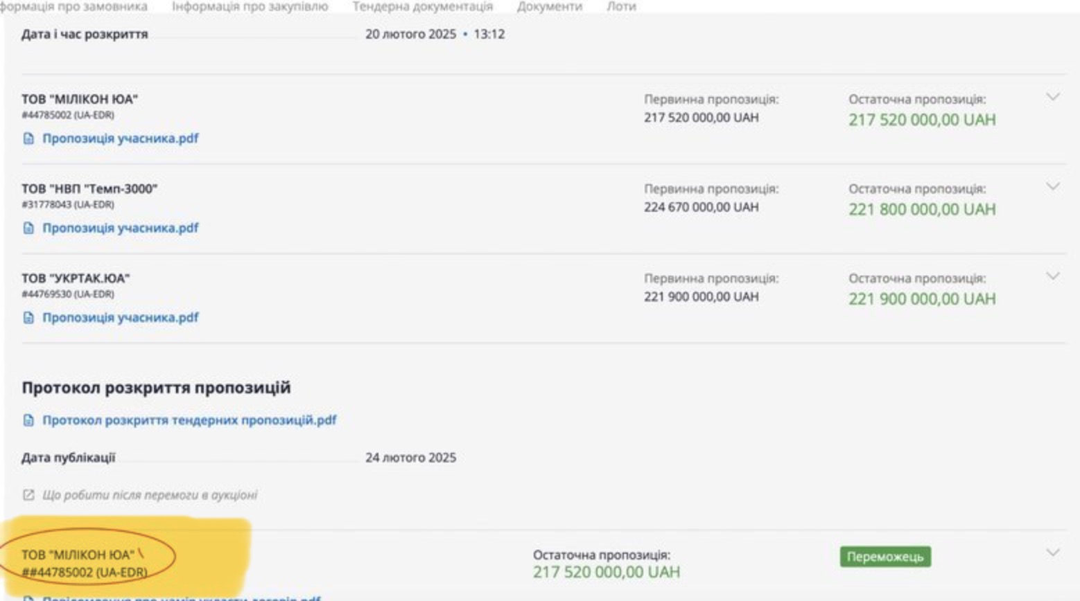 A dicembre il DOT aveva lanciato una maxi-gara da 1,6 miliardi di grivne per 75mila giubbotti: tra i partecipanti compariva anche Fortetsia Zakhystu, una piccola società con capitale sociale di 500 grivne, senza esperienza e soprattutto priva della licenza necessaria per commercializzare dispositivi di protezione individuale. Ciononostante, grazie a una modifica dei criteri di qualificazione introdotta pochi giorni prima – che permetteva di utilizzare i documenti del produttore straniero anziché quelli del fornitore – l’azienda venne dichiarata vincitrice di uno dei lotti. Solo il reclamo presentato da un concorrente portò il Servizio di Revisione contabile a rilevare l’irregolarità e a far annullare l’appalto, nonostante nessuno dei motivi previsti dalla legge giustificasse l’azzeramento generale della procedura.