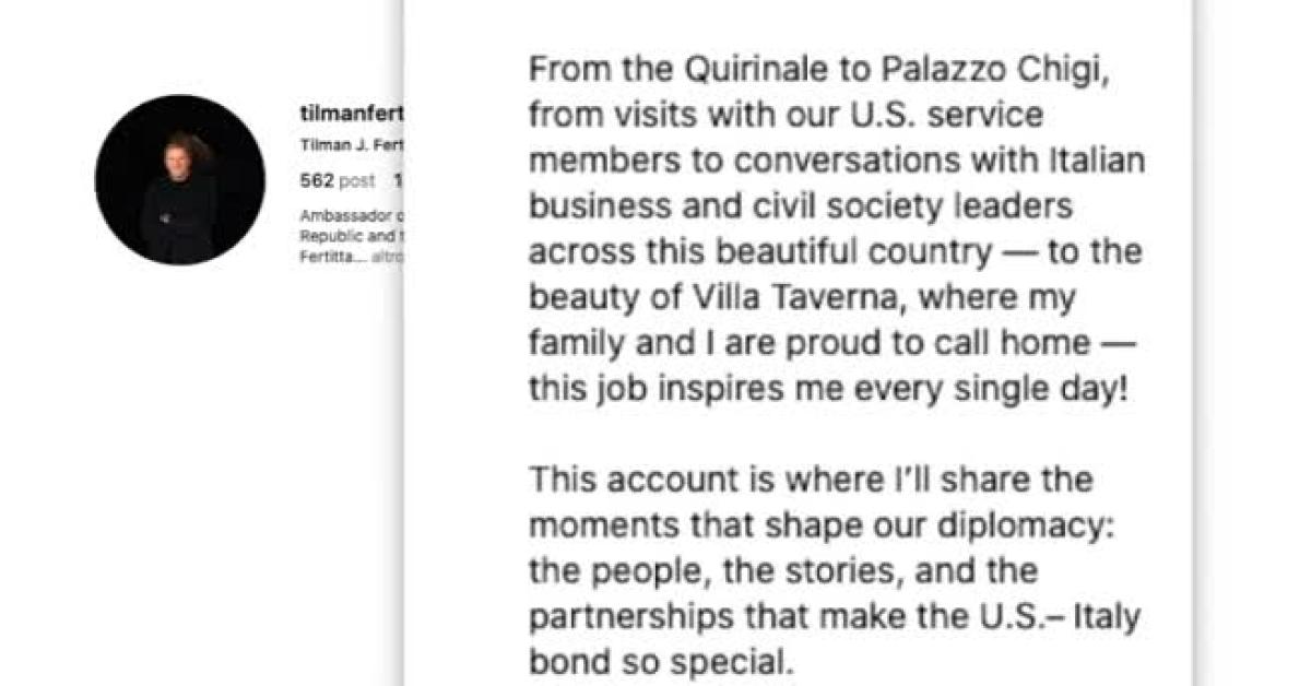 Milano, 25 nov. (askanews) - I "fantastici primi sei mesi in Italia" raccontati dallo stesso ambasciatore degli Stati Uniti d'America presso la Repubblica Italiana, il texano Tilman J. Fertitta su Instagram. "Dal Quirinale a Palazzo Chigi, dalle visite con i nostri membri del servizio statunitense alle conversazioni con i leader della società civile italiana - scrive il diplomatico - in questo bellissimo paese, fino alla bellezza di Villa Taverna, che io e la mia famiglia siamo orgogliosi di chiamare casa, questo lavoro mi ispira ogni singolo giorno!".
