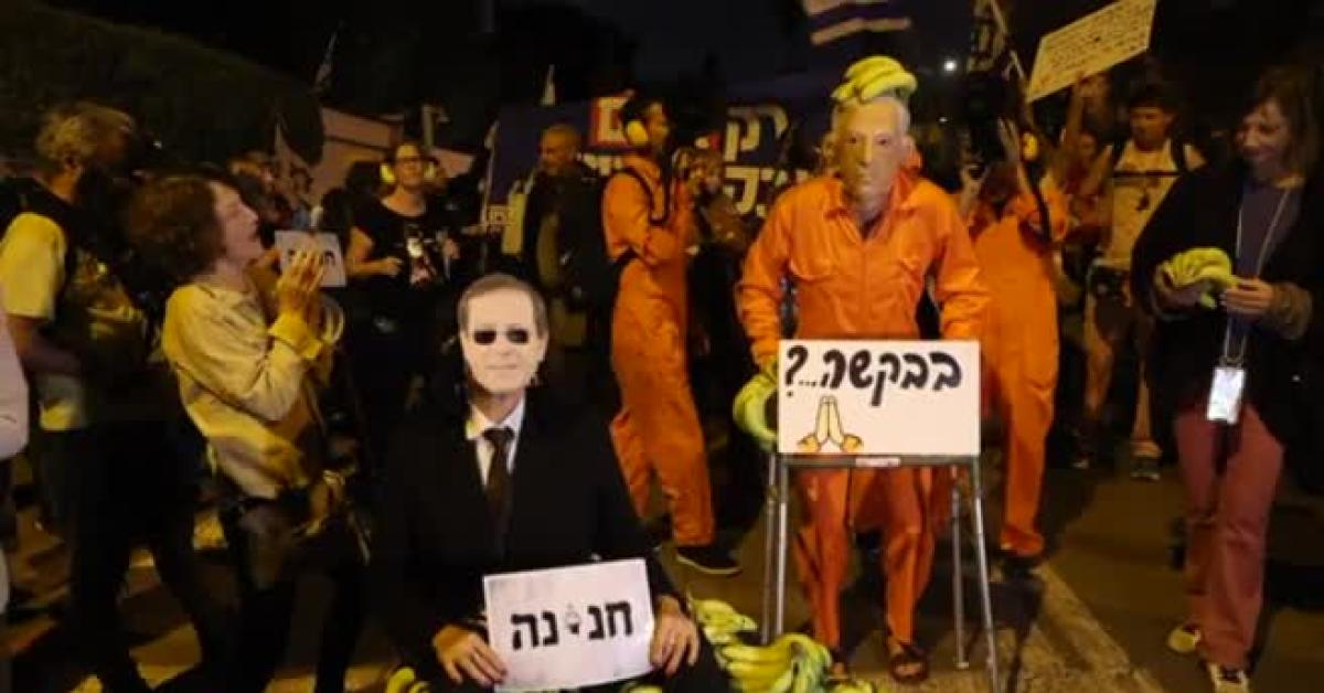 "Presidente Herzog, lei deve proteggere il popolo israeliano. Non deve proteggere il primo ministro israeliano. Il suo compito è proteggere la democrazia israeliana, il patrimonio, proteggere noi come grande nazione", hanno dichiarato alcune delle persone scese in piazza. "Grazia = Repubblica delle Banane" e "Tu sei il leader, tu sei colpevole" alcuni dei cartelli mostrati.