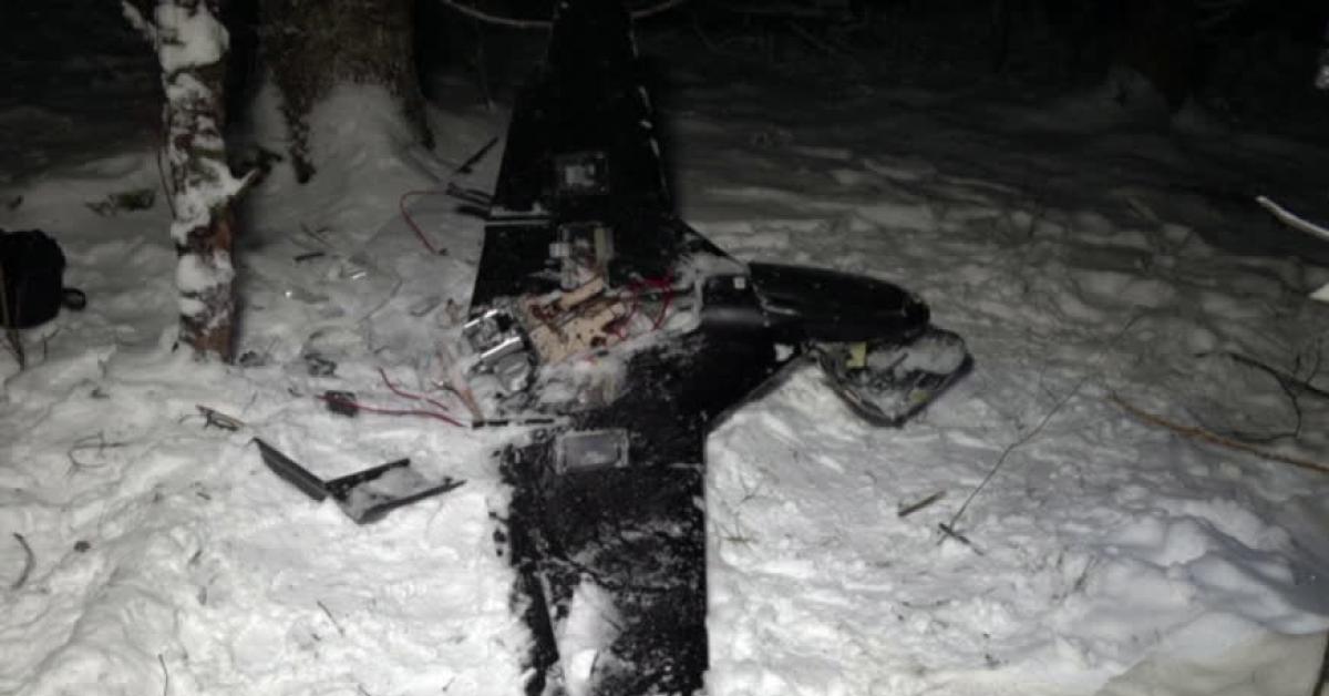 Nel video, girato di notte, si vede un drone danneggiato finito nella neve in una zona boschiva.
