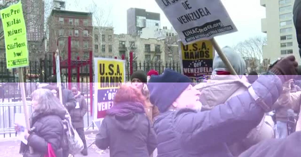 Roma, 5 gen. (askanews) - Manifestazione davanti al tribunale federale di New York dove si terrà il processo a Nicolas Maduro, per protestare contro l'operazione militare statunitense in Venezuela e la cattura del leader venezuelano. Molti i cartelli con scritto "Giù le mani dal Venezuela" rivolti al presidente Usa.