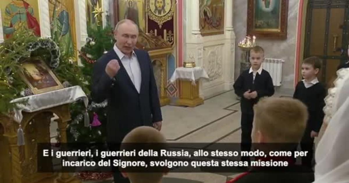 Mosca, 7 gen. (askanews) - Immagini provenienti dai media statali russi mostrano il presidente Vladimir Putin celebrare il Natale ortodosso con quelli che sarebbero, in base alle informazioni diffuse, militari russi con le loro famiglie. Nella sequenza compaiono almeno due bambini in divisa militare. Secondo i media, la funzione si è svolta presso la chiesa di San Giorgio il Vittorioso, in una zona non identificata della regione di Mosca. "Chiamiamo spesso il Signore Salvatore, perché in qualche modo è venuto sulla terra per salvare tutti gli uomini. E i guerrieri, i guerrieri della Russia, allo stesso modo, come per incarico del Signore, svolgono questa stessa missione: la difesa della Patria, la salvezza della Patria e del suo popolo", ha affermato Putin davanti ai bambini e alle loro famiglie..