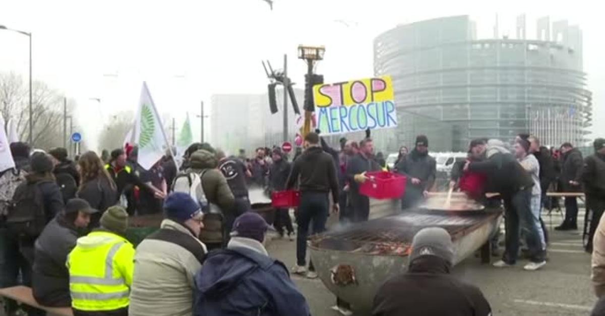 Strasburgo (Francia), 21 gen. (askanews) - Gli agricoltori continuano la protesta davanti al Parlamento europeo a Strasburgo (Basso Reno) contro l'accordo Mercosur, firmato sabato in Paraguay. Il giorno prima, circa 5.500 agricoltori, francesi ma anche italiani, belgi e polacchi, avevano raggiunto il Parlamento, alcuni arrivando in trattore.