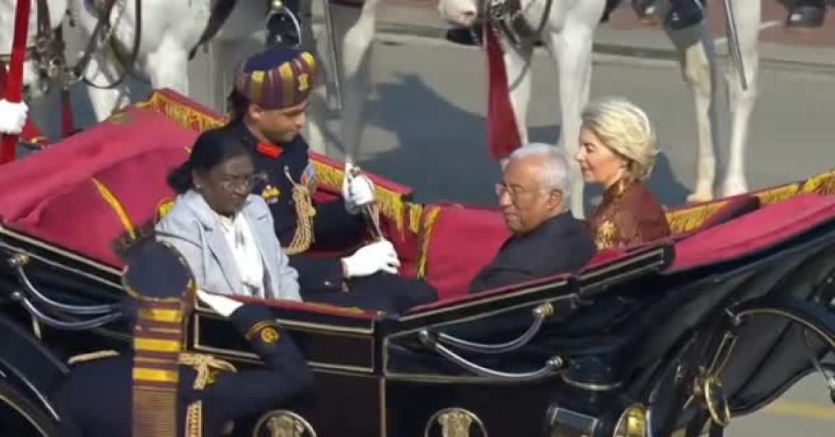 Nelle immagini rilanciate dal primo ministro indiano Narendra Modi sul suo canale youtube, si vede von der Leyen con un elegante abito tradizionale indiano in carrozza con il presidente Droupadi Murmu e Costa. Durante la cerimonia c'è stata la sfilata delle bande militari e unità di cavalleria di cavalli e cammelli con il sorvolo di aerei da combattimento.