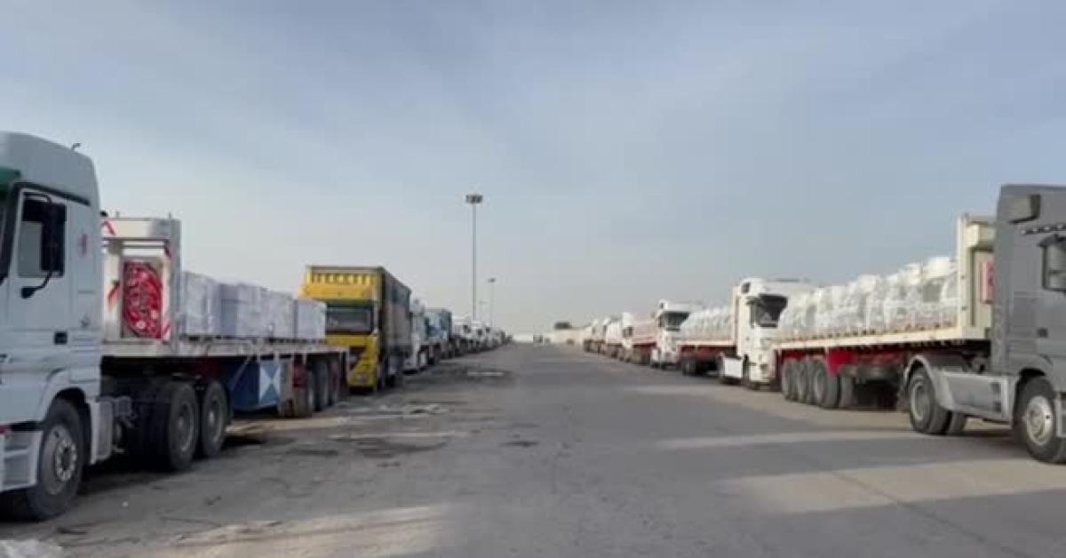 Roma, 26 gen. (askanews) - Nelle immagini, camion carichi di aiuti e materiali da costruzione in coda davanti al valico di Rafah, sul lato egiziano, in attesa del via libera per entrare a Gaza.