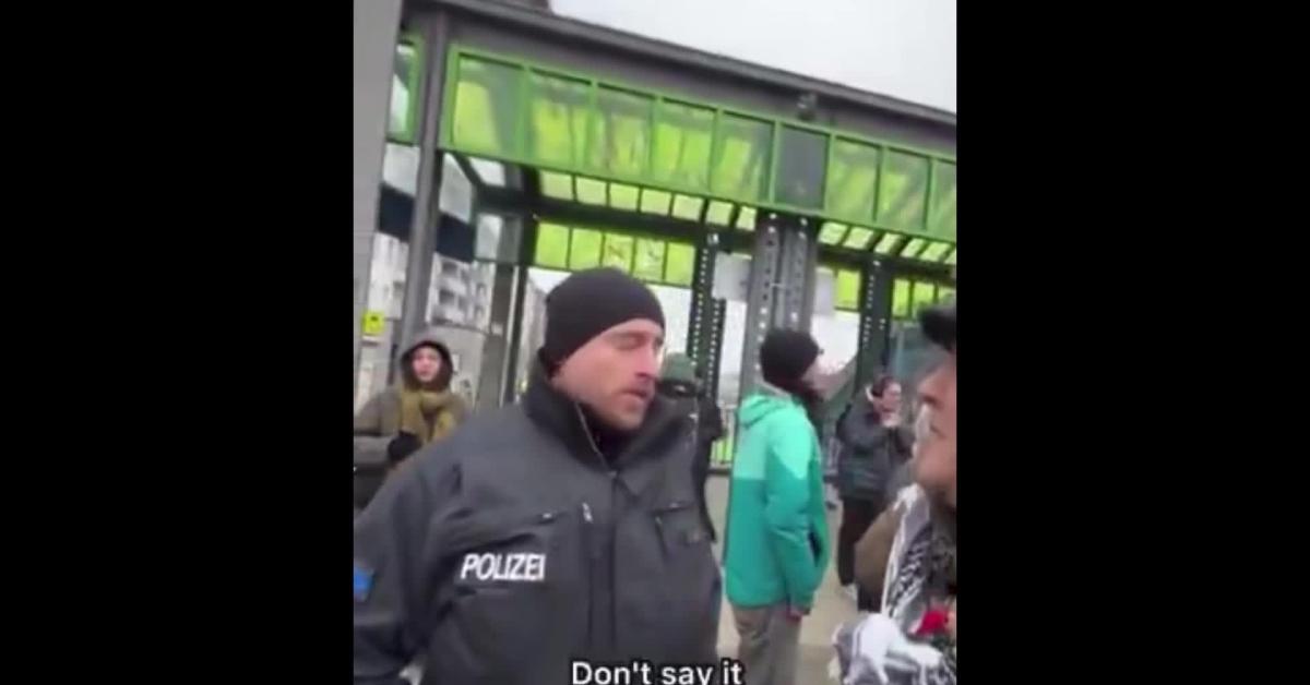 Nel filmato si sente l’agente fermare ripetutamente la donna mentre tenta di chiarire le proprie parole. "Ho detto dal fiume, non dal fiume al mare", afferma lei. Ma il poliziotto ribatte "No, lo hai detto due volte, per favore smettila, altrimenti dovremo arrestarti di nuovo". La donna allora chiede "Allora cosa dovrei dire", ricevendo come risposta "Non questa frase". Alla sua insistenza, l’agente conclude "È proibita in Germania, non voglio farlo ma dovrei arrestarti".