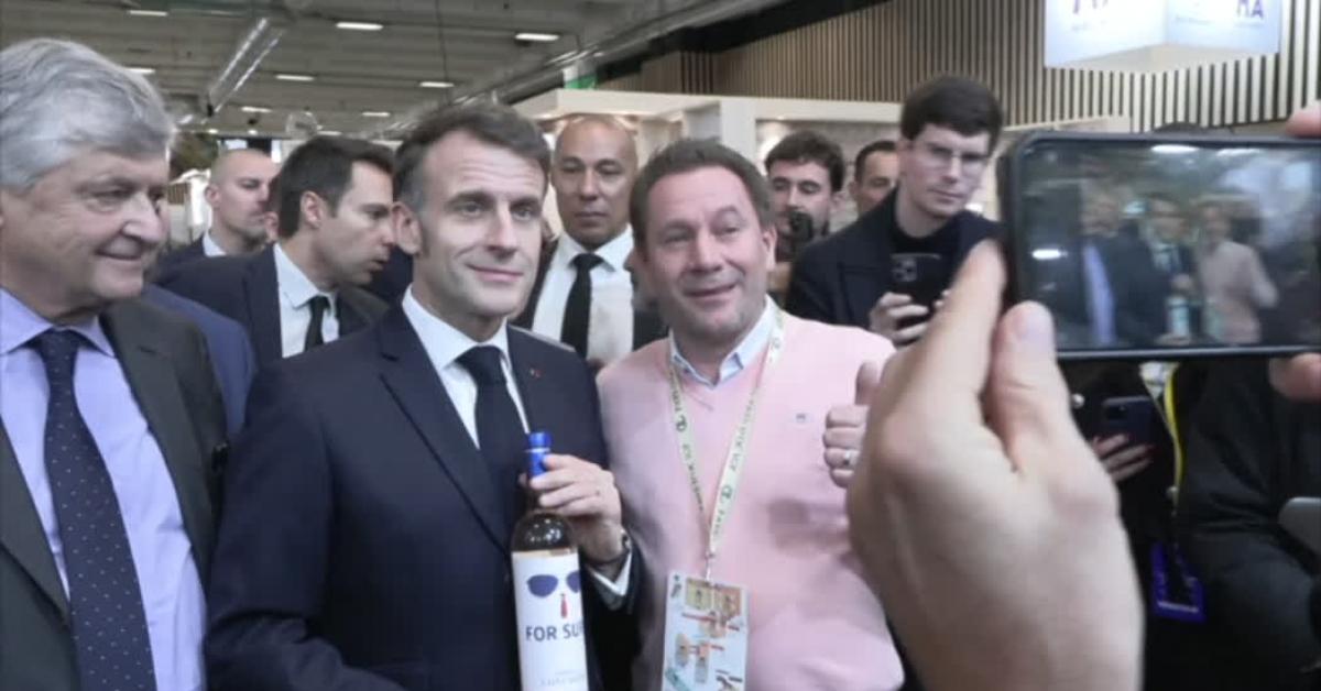 Parigi, 9 feb. (askanews) - In visita al Salone "Wine Paris", Emmanuel Macron ha ricevuto una bottiglia di rosé "For Sure", con tanto di occhiali da Top Gun raffigurati sull'etichetta e che il presidente francese ha indossato a causa di una patologia oculare durante il suo intervento al Forum di Davos 2026, un discorso in risposta alle minacce trumpiane divenuto virale sui social. "Questa è per gli Stati Uniti - ha ironizzato Macron parlando con il produttore del vino - Geniale, top!".