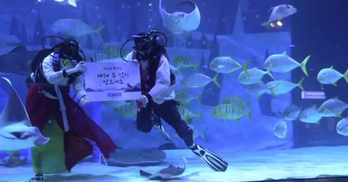 Seoul, 10 feb. (askanews) - Per celebrare l'imminente Capodanno lunare, alcuni subacquei vestiti con l'"hanbok", l'abito tradizionale della Corea del Sud, si sono immersi in un acquario di Seoul tra inchini e piroette. In mano uno striscione con la scritta "Buone Vacanze" e un cartello che recita "Buon anno nuovo!".