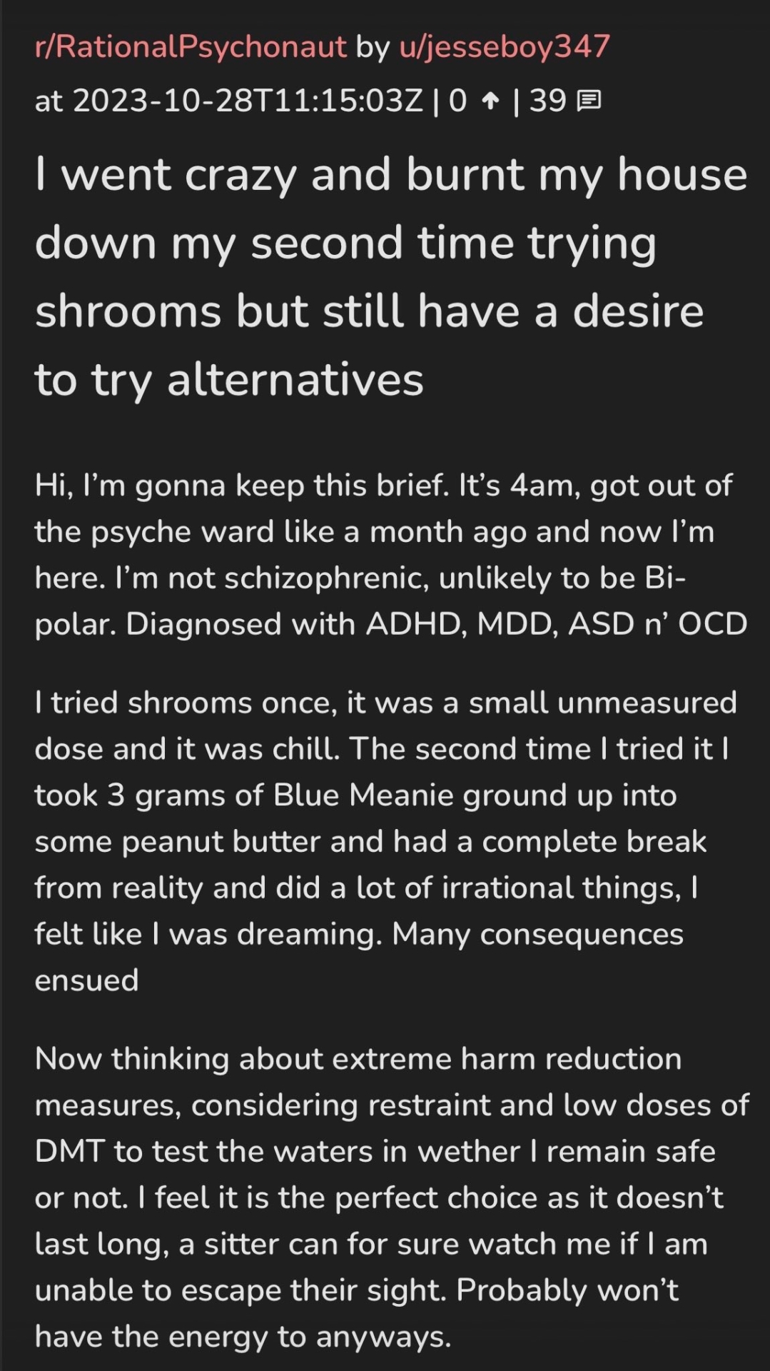 Jesse Strang, 18 anni, era già nota alle autorità e ai servizi sanitari per problemi legati alla salute mentale. Secondo quanto ricostruito, era stata più volte sottoposta a valutazioni cliniche: "Mi sono stati diagnosticati ADHD, MDD, ASD e OCD". Dai contenuti pubblicati sui social nel 2023 emergerebbe un quadro di forte sofferenza psicologica. In alcuni post la giovane parlava apertamente di depressione e di uso di farmaci pesanti, tra cui gli antidepressivi SSRIs e DMT, descrivendo momenti di profonda instabilità emotiva e pensieri autodistruttivi. In uno dei messaggi avrebbe scritto di sentirsi "vuota e senza controllo", mentre in un altro faceva riferimento a stati mentali alterati e a un senso costante di alienazione. Un caso di distacco con la realtà è avvenuto dopo che la ragazza aveva assunto 3 grammi di funghi psichedelici Blue Marine, spingendola inconsciamente a bruciare casa.