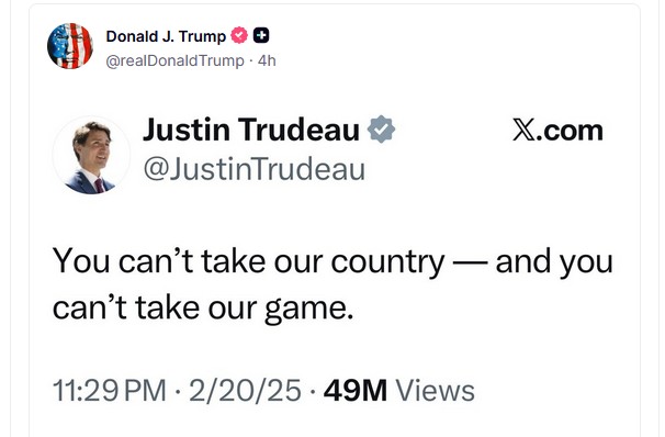 Il post di Trump, sulle note del vincente brano "Eye of the Tiger", risponde ad un post del primo ministro canadese Trudeau che, il 20 Febbraio scorso scriveva "Non puoi portarci via il nostro Paese e non puoi portarci via il nostro gioco", commentando direttamente la vittoria del Canada nella finale 4 Nation. Ma ieri, 22 Febbraio, alle Olimpiadi di Milano-Cortina l'esito è stato diverso: gli Usa hanno vinto l'oro e per enfatizzare ancor di più la sconfitta canadese, la Casa Bianca provvedeva già a diffondere un post raffigurante un'aquila dalla testa bianca mentre immobilizza un'oca canadese. Poche ore fa però Trump ha alzato il tiro con un nuovo contenuto social, dimostrando come la sconfitta canadese nel gioco equivale anche alla sua potenziale sconfitta nello scacchiere geopolitico.