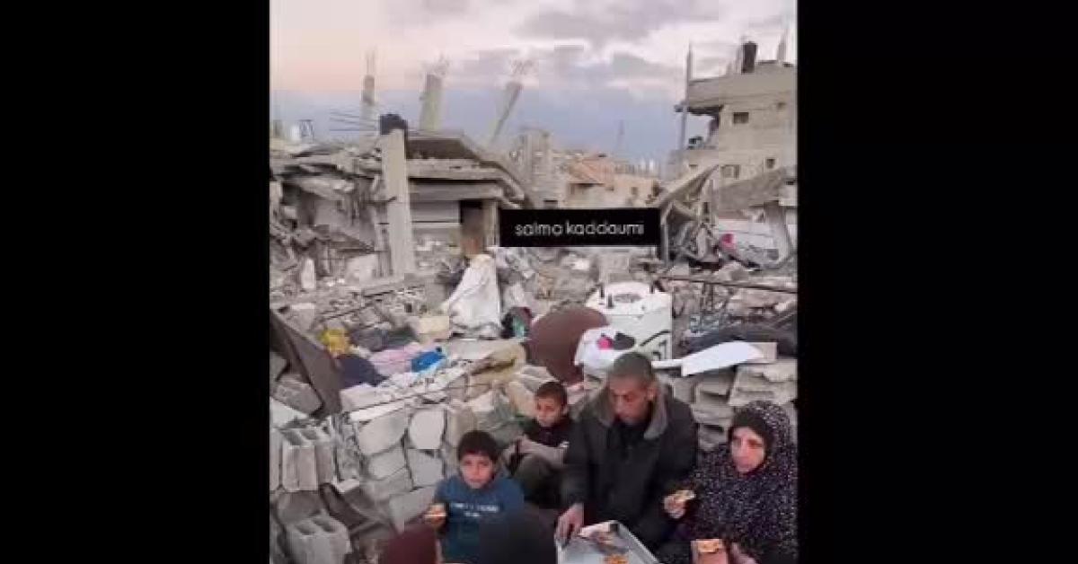 Il filmato mostra i membri della famiglia riuniti tra le rovine della loro vecchia abitazione distrutta dai bombardamenti condotti dalle Forze di Difesa Israeliane. Nel video una donna, un uomo e quattro bambini preparano e consumano una pizza, mangiando seduti tra detriti e strutture crollate di quello che un tempo era il loro edificio. Le immagini documentano un momento di quotidianità in un contesto segnato dalla distruzione. Il pasto viene cucinato e condiviso sopra i resti della casa bombardata, mentre intorno si intravedono edifici danneggiati e ampie aree devastate.