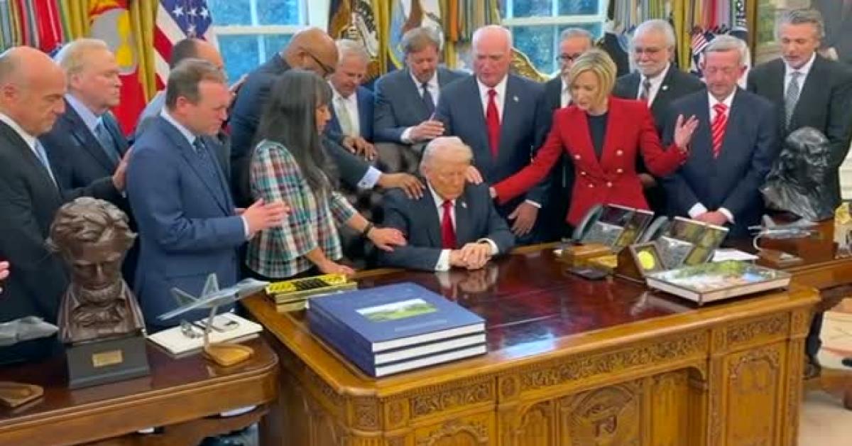 "Prego per la tua grazia e la tua protezione su di lui. Prego per la tua grazia e protezione sulle nostre truppe e su tutti i nostri uomini e donne che prestano servizio nelle nostre forze armate" dice uno dei religiosi che circondano e toccano le spalle e le braccia di Trump seduto alla scrivania, ad occhi chiusi.