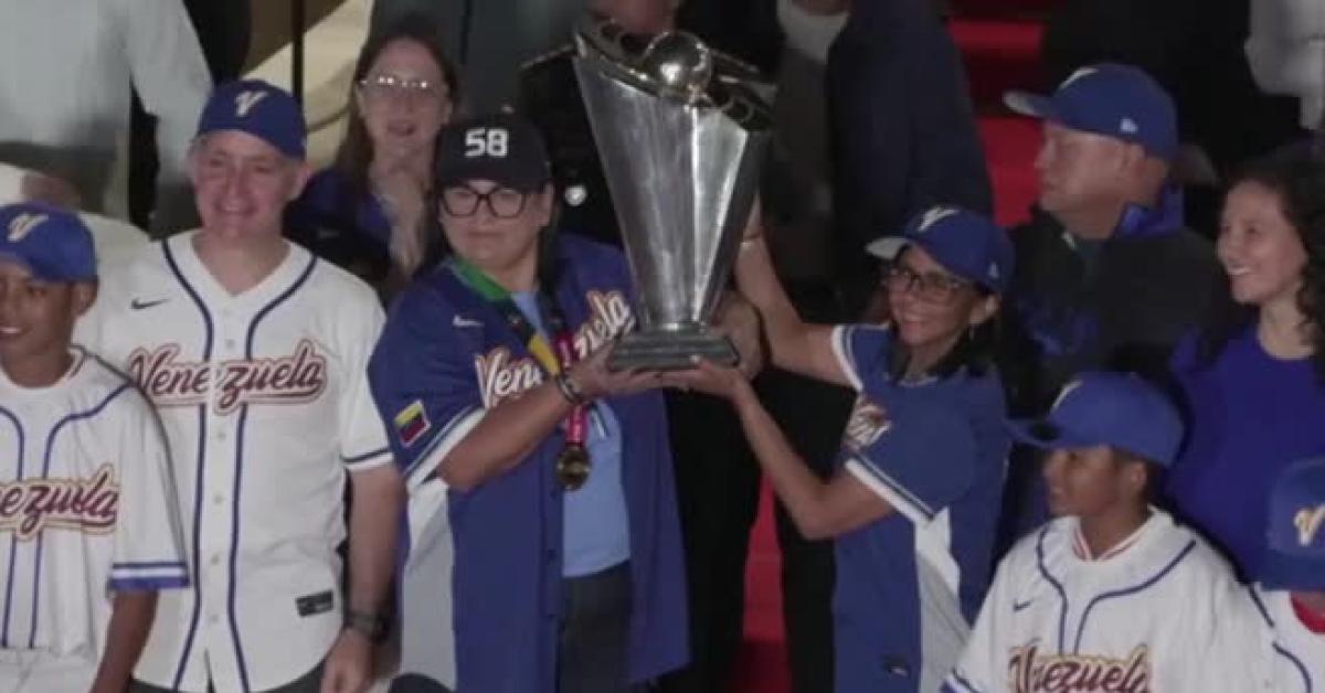 La presidente ad interim Delcy Rodrìguez riceve il trofeo dalle mani della presidente della Federazione venezuelana di baseball Aracelis Leòn, in una cerimonia che accompagna il racconto istituzionale del trionfo.