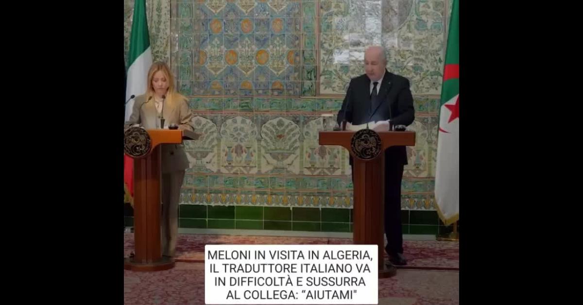 Durante la conferenza stampa congiunta tra la premier italiana Giorgia Meloni, in visita ad Algeri, in Algeria, e il presidente algerino Abdelmadjid Tebboune, il traduttore italiano è apparso in evidente difficoltà. Dopo aver ripetuto le stesse parole più volte, ha iniziato a tentennare pronunciando "ehm, ehm", fino al silenzio di qualche secondo e la richiesta al collega: "Aiutami". Tebboune, accorgendosi dell'assenza della voce del traduttore, porta un dito all'orecchio cercando di avvisare qualcuno. Poi improvvisamente la traduzione riprende, ma con una voce completamente diversa, quella del collega che ha sostituito l'interprete in difficoltà.