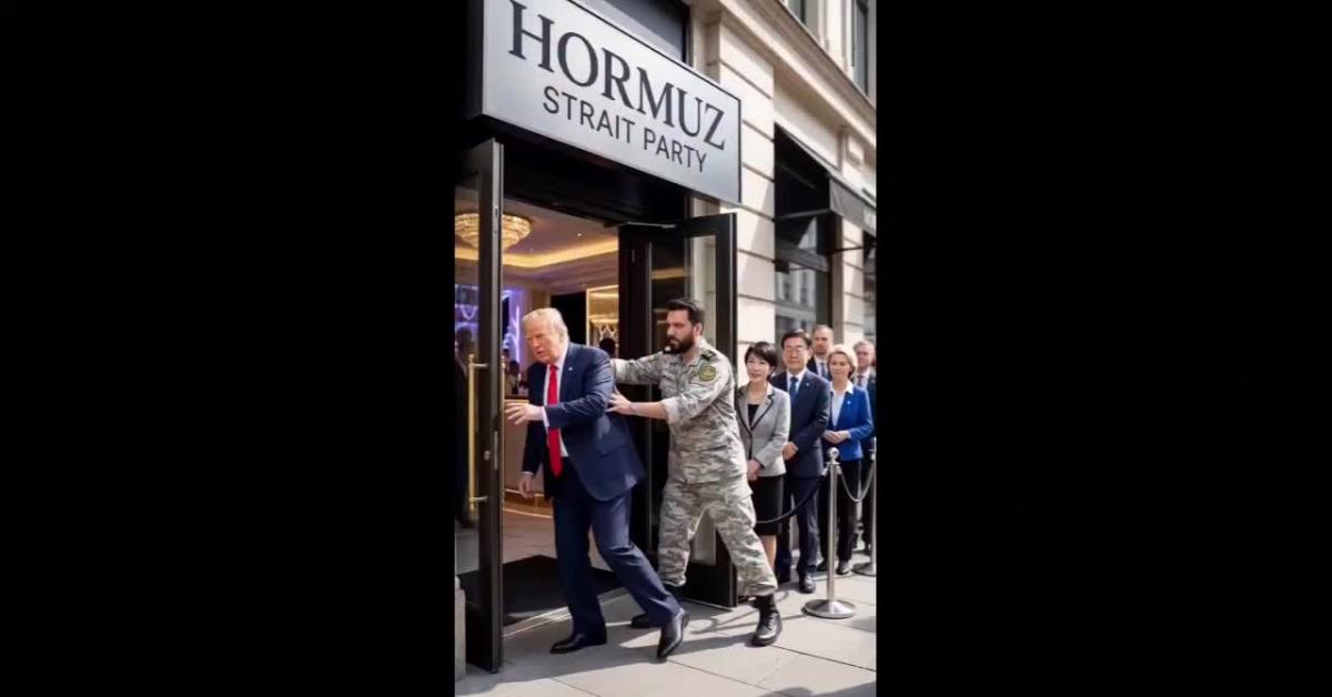 Donald Trump intercettato e cacciato dal locale Hormuz Strait Party nel quale cercava di imbucarsi saltando la fila dei vari leader mondiali, in attesa di potervi accedere. È diventato virale il contenuto di un video creato con l'intelligenza artificiale che traduce in modo satirico l'estromissione degli Stati Uniti dallo Stretto di Hormuz dopo che l'Iran ne ha imposto il blocco a inizio conflitto. È un'ironia pungente, che lascia alla metafora un chiaro messaggio politico.
