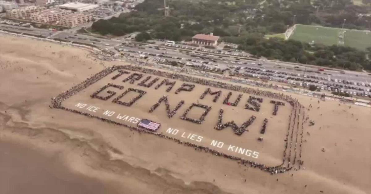 "TRUMP DEVE ANDARSENE ORA" ("TRUMP MUST GO NOW"): queste le quattro parole che ieri, 28 Marzo, centinaia e centinaia di manifestanti No Kings hanno "scritto" coi loro corpi sull'Ocean Beach realizzando un cartello umano largo oltre 180 metri. Queste immagini impressionanti arrivano da San Francisco, una tra le tantissime città che, in tutto il mondo, hanno accolto ieri cortei e manifestazioni per dire basta alle politiche anti-immigrazione di Trump, per denunciare il genocidio di Gaza, per condannare la guerra illegale contro l'Iran.