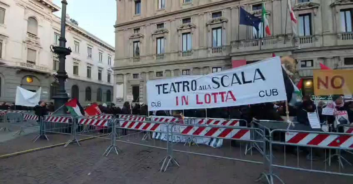 Oggi si è svolto il corteo pro Palestina libera, davanti al teatro alla Scala di Milano, con il presidio per il mondo dello spettacolo organizzato dalla Cgil."I giudici hanno detto che è illegittimo il licenziamento della maschera che alla Scala ha gridato 'Palestina libera' e quindi urliamo insieme al teatro 'Palestina libera!'": in piazza Scala a Milano come ogni 7 dicembre vanno in scena le proteste in occasione dell'inaugurazione della stagione lirica del teatro. Da un lato è in corso il presidio per il mondo dello spettacolo organizzato dalla Cgil, dall'altro ci sono manifestanti di Cub e proPal insieme.