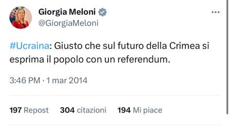 Nel video del 2023 pubblicato qualche giorno fa, la premier cambia afferma: "Caro Volodymyr Zelensky, oggi siamo al vostro fianco, senza esitazioni. E siamo qui oggi per ribadire, con forza, che la Russia deve porre fine alla sua politica di occupazione e ritirare le sue truppe. Non ci stancheremo di lavorare per porre fine alla guerra e giungere ad una pace giusta e duratura. Caro presidente Zelensky, cari colleghi, l’annessione illegale della Crimea nel 2014 da parte della Russia è stata una chiara violazione del diritto internazionale e un assaggio delle intenzioni aggressive russe su tutta l’Ucraina. Da allora Mosca ha imposto il suo modello autoritario e ha violato i diritti delle popolazioni della penisola, primi fra tutti i tatari. Nel 2014 in Occidente non si era compreso appieno la portata di quanto stava accadendo o, forse, si era sperato che potesse fermarsi lì la pulsione imperialista di Mosca. Abbiamo sbagliato, ed è doveroso riconoscerlo. Intendiamo essere al vostro fianco per ricostruire la vostra Nazione, anche organizzando in Italia ‘Ukraine Recovery Conference’ nel 2025, per dare così un futuro di opportunità al popolo ucraino e contribuire alla vostra rinascita, economica e sociale. Il futuro dell’Ucraina è un futuro di pace, di libertà e di benessere. È un futuro, nella sua integrità territoriale, all’interno della Casa comune europea. Perché la vostra eroica resistenza è la nostra battaglia per la democrazia. La vostra libertà è la libertà per l’Europa intera".