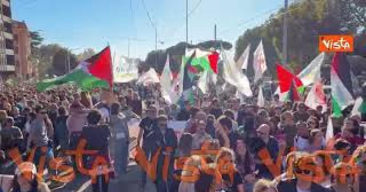 Un'enorme bandiera della Palestina al corteo pro Gaza a Roma