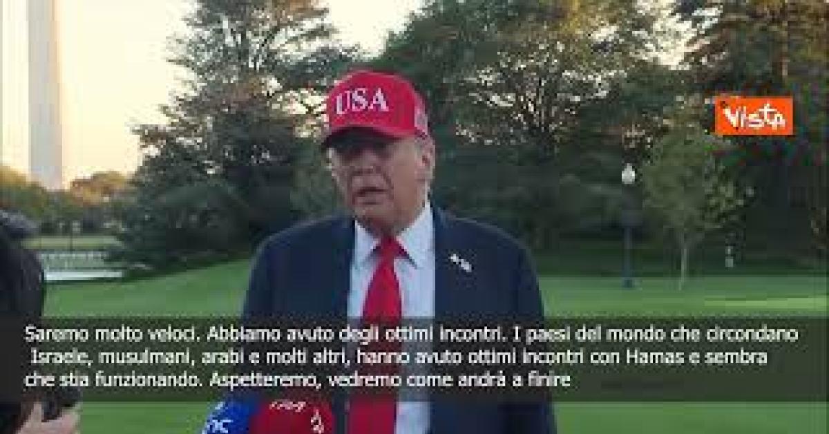 (Agenzia Vista) Washington, 06 ottobre 2025 “Saremo molto veloci. Abbiamo avuto degli ottimi incontri. I paesi del mondo che circondano Israele, musulmani, arabi e molti altri, hanno avuto ottimi incontri con Hamas e sembra che stia funzionando. Aspetteremo un po', vedremo come andrà a finire.” Così il Presidente degli Stati Uniti Donald Trump, davanti alla Casa Bianca. Courtesy: The White House Fonte: Agenzia Vista / Alexander Jakhnagiev