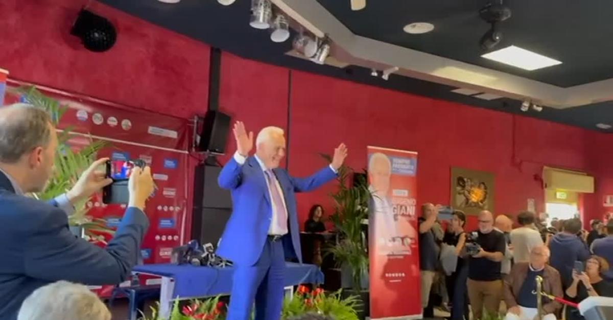 Firenze, 13 ott. (askanews) - Eugenio Giani confermato presidente della Regione Toscana: gli applausi all'arrivo al comitato elettorale a Firenze.