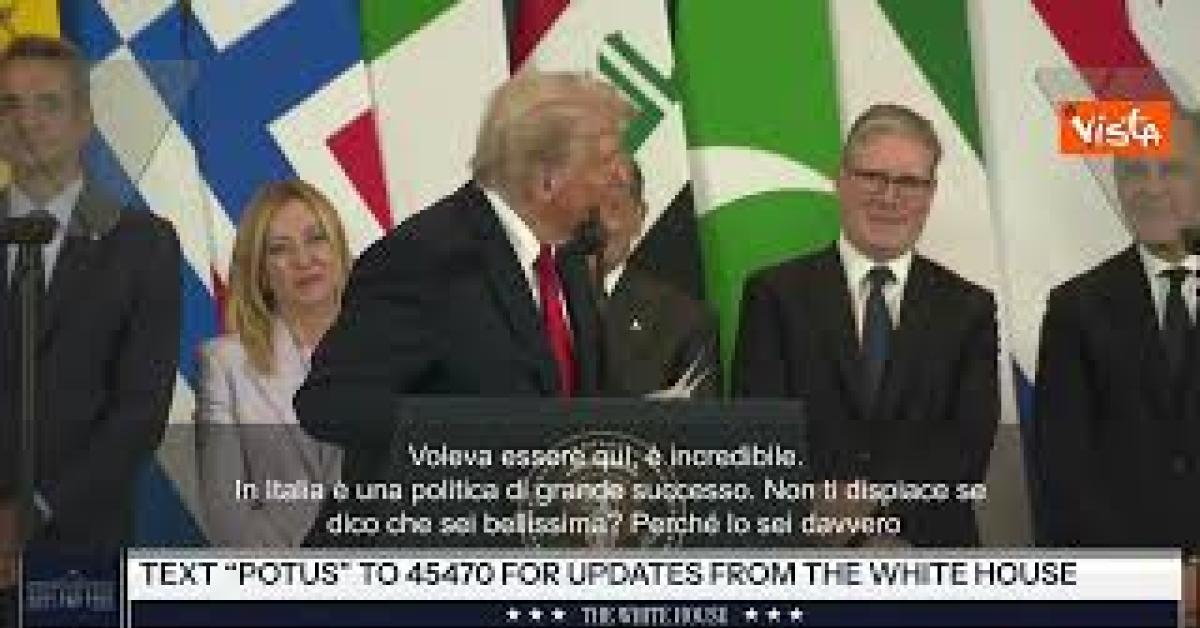 (Agenzia Vista) Usa, 13 ottobre 2025 "Negli Stati Uniti, se dici a una donna che è bella, la tua carriera politica è finita — ma io correrò il rischio. Non ti offenderai se ti dico che sei bella, vero? Perché lo sei", così Trump a Meloni durante la firma degli accordi di pace per Gaza. White House Fonte: Agenzia Vista / Alexander Jakhnagiev