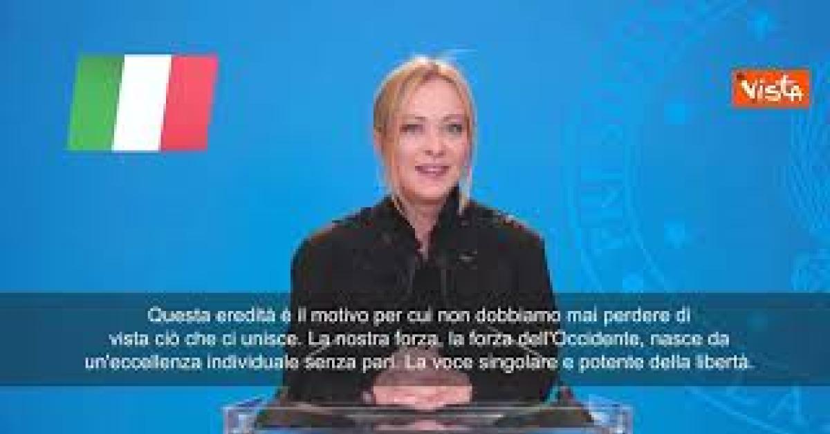 (Agenzia Vista) Roma, 19 ottobre 2025 "La nostra forza, la forza dell'Occidente, nasce da un'eccellenza individuale senza pari. La voce singolare e potente della libertà. Ma essa si perfeziona solo quando l'intera orchestra suona insieme in un'armonia impeccabile e potente. Questa eredità è il motivo per cui non dobbiamo mai perdere di vista ciò che ci unisce. La nostra forza, la forza dell'Occidente, nasce da un'eccellenza individuale senza pari. La voce singolare e potente della libertà. Ma essa si perfeziona solo quando l'intera orchestra suona insieme in un'armonia impeccabile e potente. Questa eredità è il motivo per cui non dobbiamo mai perdere di vista ciò che ci unisce". Così la premier Giorgia Meloni, nel videomessaggio inviato in occasione del 50esimo anniversario della Niaf, la National Italian American Foundation. Chigi Fonte: Agenzia Vista / Alexander Jakhnagiev