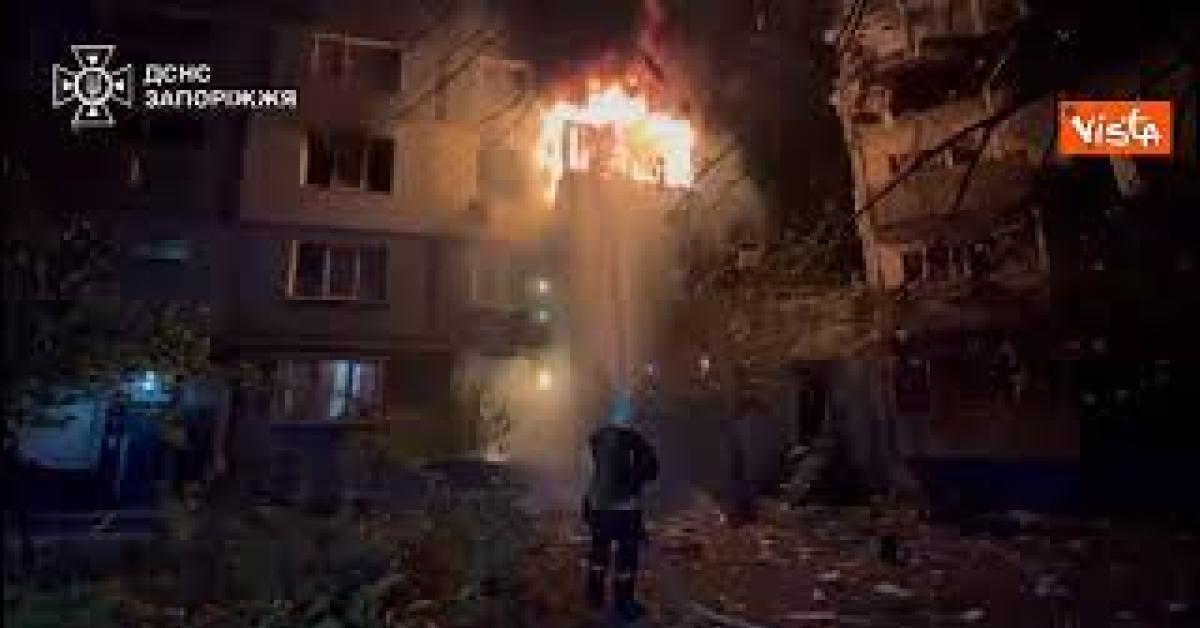 (Agenzia Vista) Kiev, 22 ottobre 2025 Palazzi in fiamme dopo l'impatto di un drone russo a Kharkiv. Colpito anche un asilo. Telegram Fonte: Agenzia Vista / Alexander Jakhnagiev