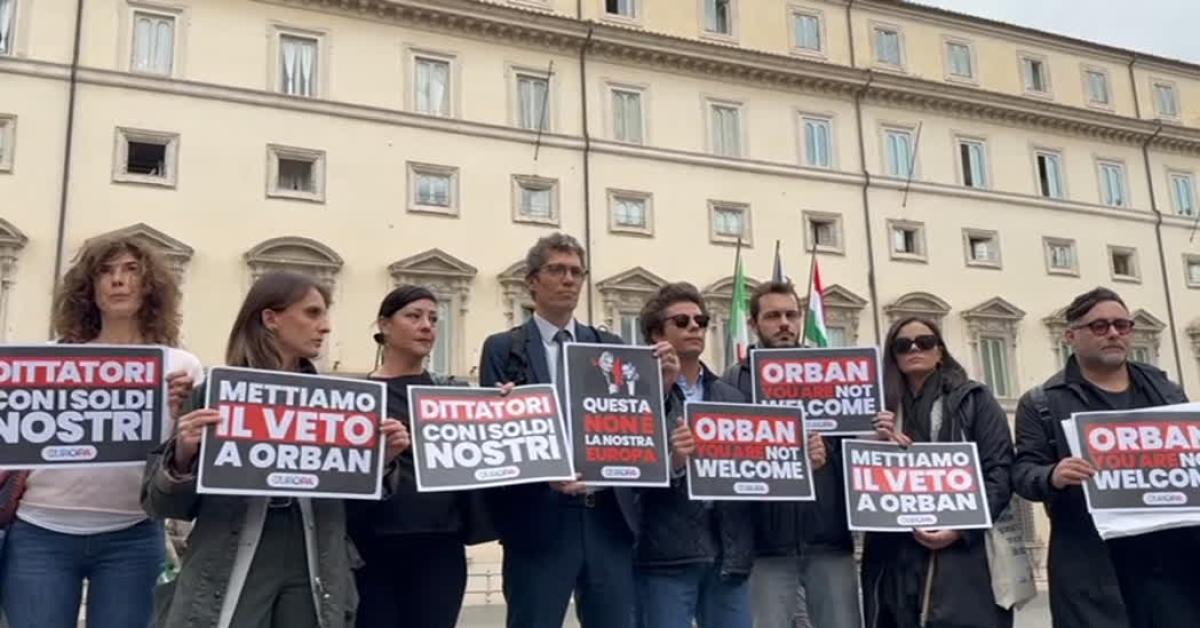 Un flash mob organizzato da Più Europa, il segretario Riccardo Magi ha dichiarato: "Solo poche settimane fa Orban ha detto che la colpa dell'invasione russa in Ucraina è dell'Europa, ha sempre rappresentato il governo europeo più servizievole nei confronti di Putin, quella rappresentata a Palazzo Chigi oggi non è la nostra Europa, ma quella di un impostore che ha ricevuto miliardi di contributi, soldi di tutti i cittadini europei, per usarli nel proprio Paese ma per annientare la democrazia in Ungheria".
