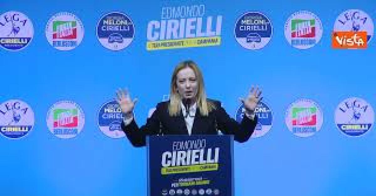 (Agenzia Vista) Napoli, 15 novembre 2025 "Noi siamo tutti scemi a cospetto del genio, ma solo che questo si chiama gioco delle tre carte perchè De Luca cita volutamente solo le urgenti e brevi che sono notoriamente una quantità limitata e non dice cosa accade nelle altre classi che sono circa 80% delle prestazioni totali, lui non ve lo dice ma io si perchè si sa che sono un po' str...", così Giorgia Meloni al comizio del centrodestra a Napoli a sostegno di Edmondo Cirielli. FdI Fonte: Agenzia Vista / Alexander Jakhnagiev