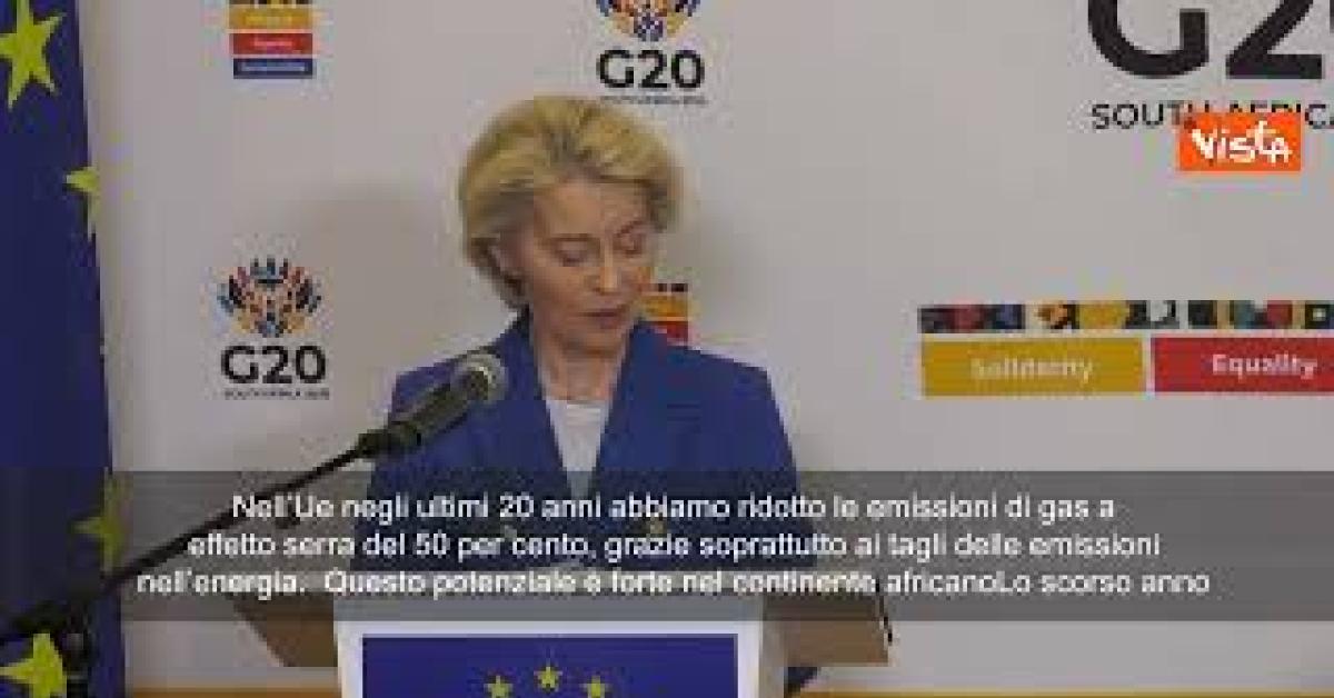 La vera questione, quando si parla di cambiamenti climatici, è l’energia. Non stiamo combattendo i combustibili fossili, quanto le emissioni che derivano dai combustibili fossili. Nell’Ue negli ultimi 20 anni abbiamo ridotto le emissioni di gas a effetto serra del 50 per cento, grazie soprattutto ai tagli delle emissioni nell’energia. Questo potenziale è forte nel continente africanoLo scorso anno gli investimenti in energia pulita hanno raggiunto i duemila miliardi di euro a livello globale, ma solo il 2 per cento di questi investimenti è stato destinato all’Africa, il continente con il 60 per cento del miglior potenziale solare al mondo" Così la presidente della Commissione europea, Ursula von der Leyen al G20.