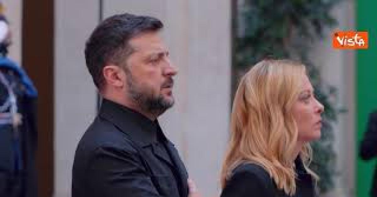 Zelensky canta inno ucraino durante onori militari a Palazzo Chigi con Giorgia Meloni