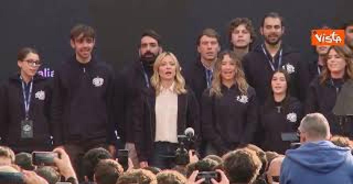 Meloni sul palco di Atreju con la felpa dei volontari canta l'Inno di Mameli