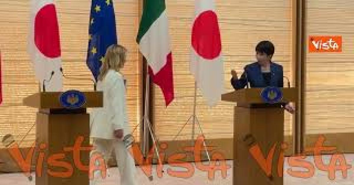 La stretta di mano tra Meloni e Takaichi al termine della conferenza stampa a Tokyo