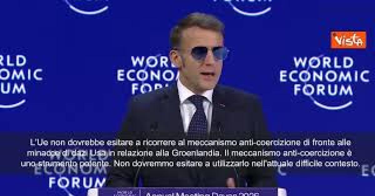 (Agenzia Vista) Davos, 20 gennaio 2026 "L'Unione europea non dovrebbe esitare a ricorrere al meccanismo anti-coercizione di fronte alle minacce di dazi Usa in relazione alla Groenlandia. Il meccanismo anti-coercizione è uno strumento potente e non dovremmo esitare a utilizzarlo nell'attuale difficile contesto.", scherza così Macron a Davos, ricevendo un applauso dal pubblico del Wef. Wef Fonte: Agenzia Vista / Alexander Jakhnagiev