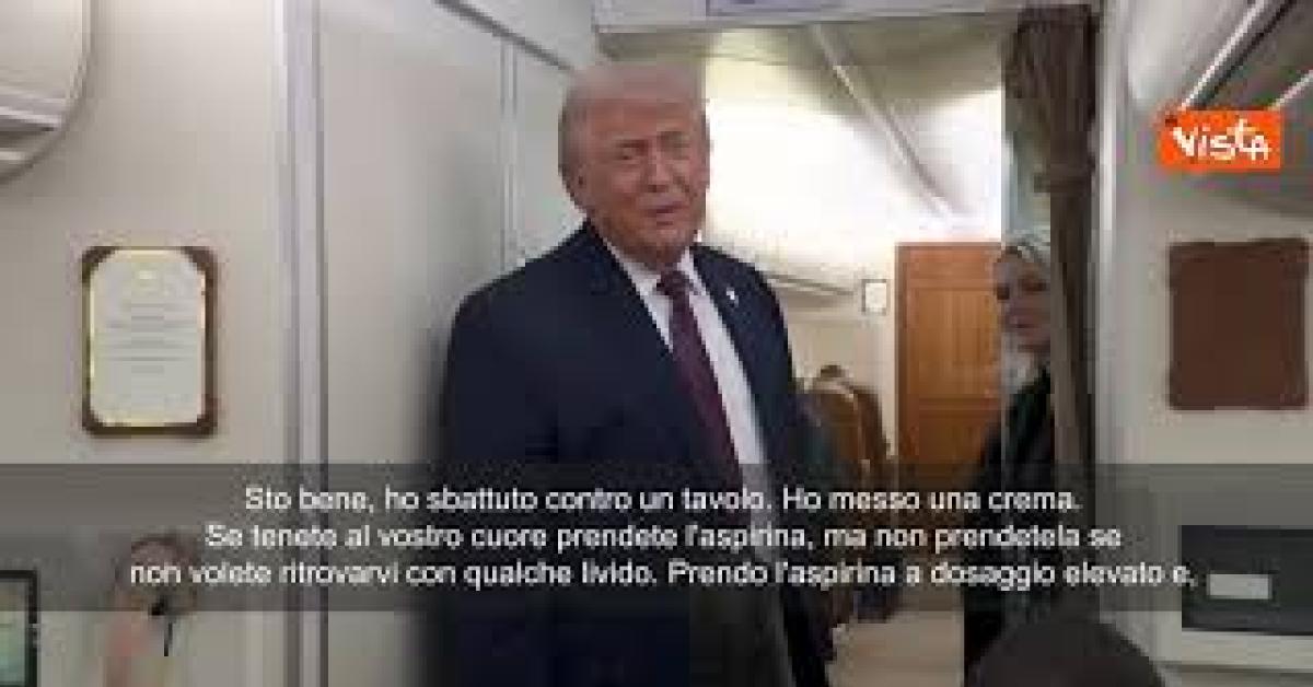 (Agenzia Vista) Usa, 23 gennaio 2026 "Sto bene, ho sbattuto contro un tavolo. Ho messo una crema. Se tenete al vostro cuore prendete l'aspirina, ma non prendetela se non volete ritrovarvi con qualche livido. Prendo l'aspirina a dosaggio elevato e, quando si prende l'aspirina a quel dosaggio, dicono che compaiono i lividi. Il medico mi ha detto che non ho bisogno di prenderla perché sono in ottima salute, ma gli ho risposto che non voglio correre rischi", lo ha detto il Presidente Usa Trump. WhiteHouse Fonte: Agenzia Vista / Alexander Jakhnagiev