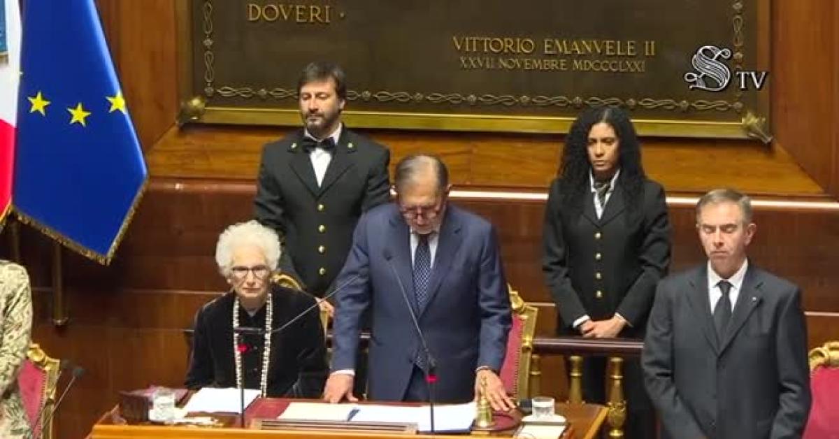 Roma, 27 gen. (askanews) - La celebrazione in Aula al Senato del Giorno della Memoria da parte del presidente, Ignazio La Russa, accanto alla senatrice a vita, Liliana Segre.