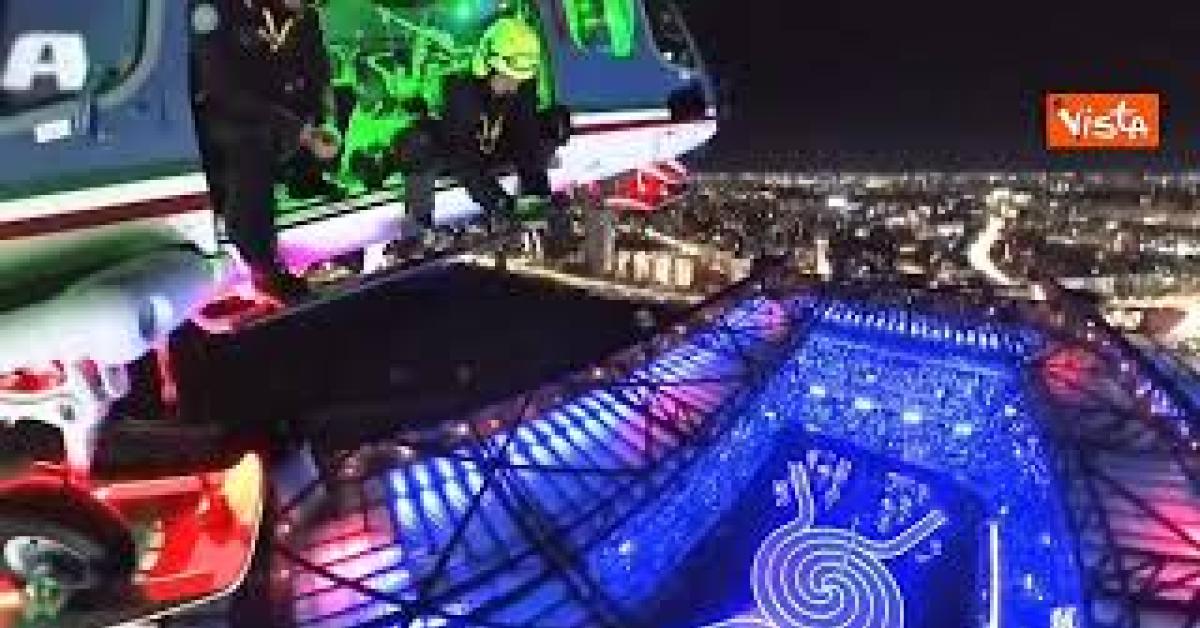 Cerimonia d'apertura Milano Cortina, la visuale dall'alto dall'elicottero della Polizia di Stato