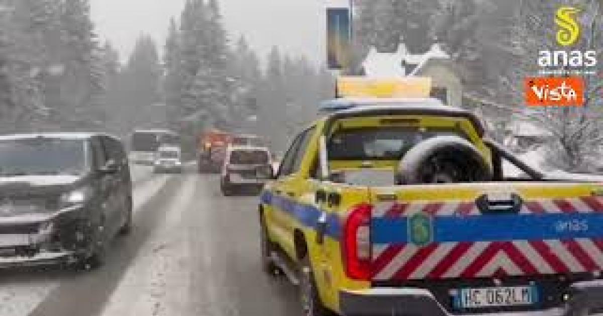 Forte nevicata sulla Statale 51 vicino Belluno, in corso operazioni Anas per pulire la strada