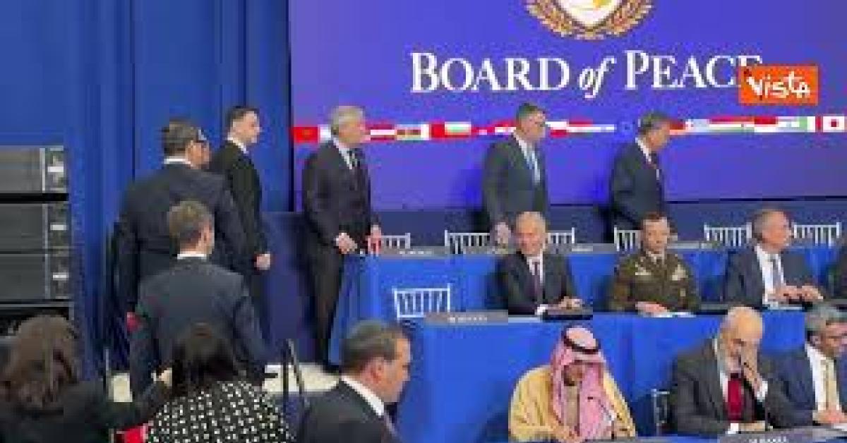 (Agenzia Vista) Washington, 19 febbraio 2026 Il Presidente degli Stati Uniti Donald Trump apre la prima riunione del Board of Peace per Gaza. L’Italia partecipa come Paese osservatore con il ministro degli Esteri Antonio Tajani, a Washington. Alcuni dei leader sono entrati nella sala tenendo in mano un berretto rosso. Fonte: Agenzia Vista / Alexander Jakhnagiev