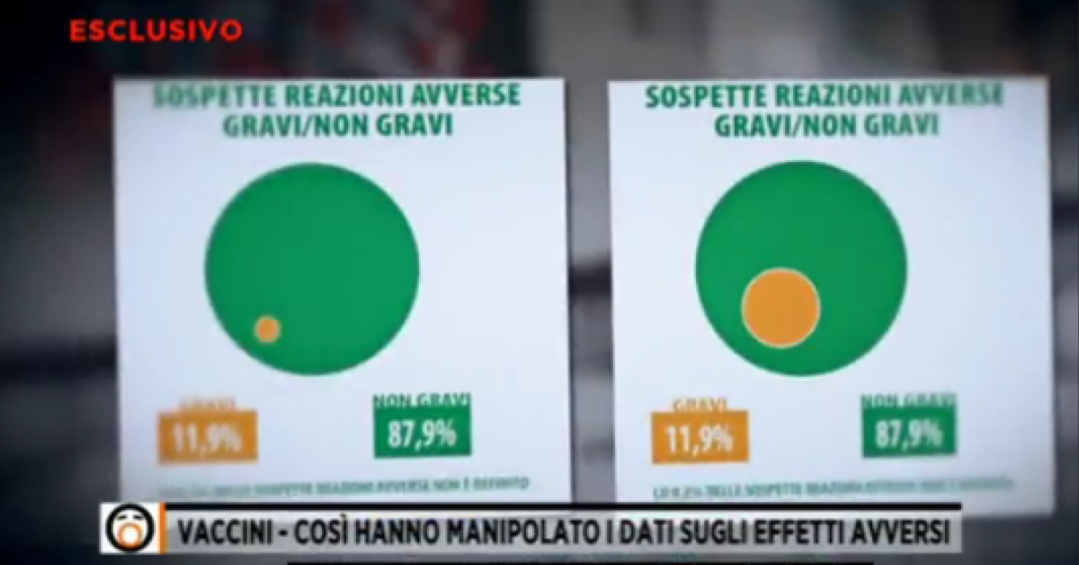 L'Aifa, inoltre, si prodiga per fare un grafico consapevolmente falso, con le proporzioni sbagliate. Si dovrebbero rappresentare le reazioni avverse gravi (11%), però l'area colorata corrisponde solo al 2%.