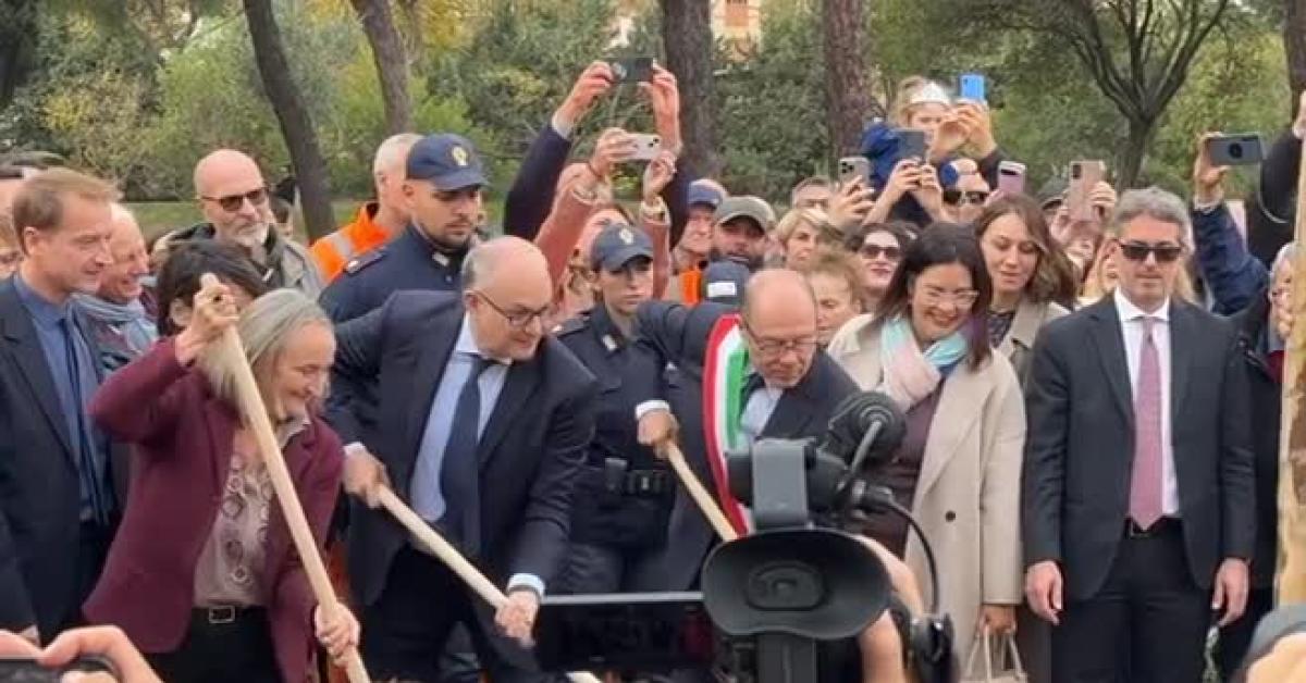 L'attore e regista, sempre con al fianco il "vero" sindaco Roberto Gualtieri, come prima tappa si è recato a Villa Gordiani, nel V Municipio, l'area dove si era verificata l'esplosione lo scorso luglio, dove ha presenziato all'inaugurazione di una nuova area bimbi e alla piantumazione di una sughera, tra i bambini che lo festeggiavano, prendendo anche simbolicamente la vanga in mano.