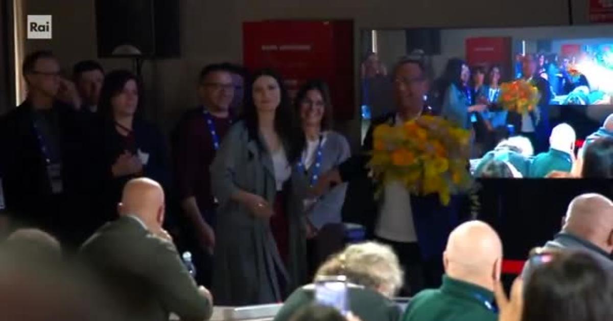 Il direttore artistico le ha regalato un mazzo di fiori gialli invitandola a sedersi accanto a lui per la presentazione di quest'anno. Pausini è stata salutata da un applauso della sala stampa.