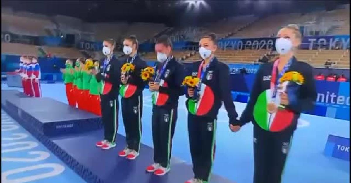 Le Farfalle della ginnastica ritmica hanno conquistato la medaglia di bronzo alla finale a squadre alle Olimpiadi di Tokyo 2020: gustiamoci il VIDEO dell'esibizione. Questo è il terzo podio olimpico per l'Italia. Le azzurre Martina Centofanti, Agnese Duranti, Alessia Maurelli, Daniela Mogurean, Martina Santandrea hanno chiuso con 87.700 punti. Oro alla Bulgaria con 92.100 e argento alla Russia con 90.400. La medaglia delle Farfalle regala all'Italia un altro record: ha conquistato almeno una medaglia in tutti i giorni di gara delle Olimpiadi giapponesi. L'altro record stava nel numero di medaglie, mai così tante in un olimpiade.